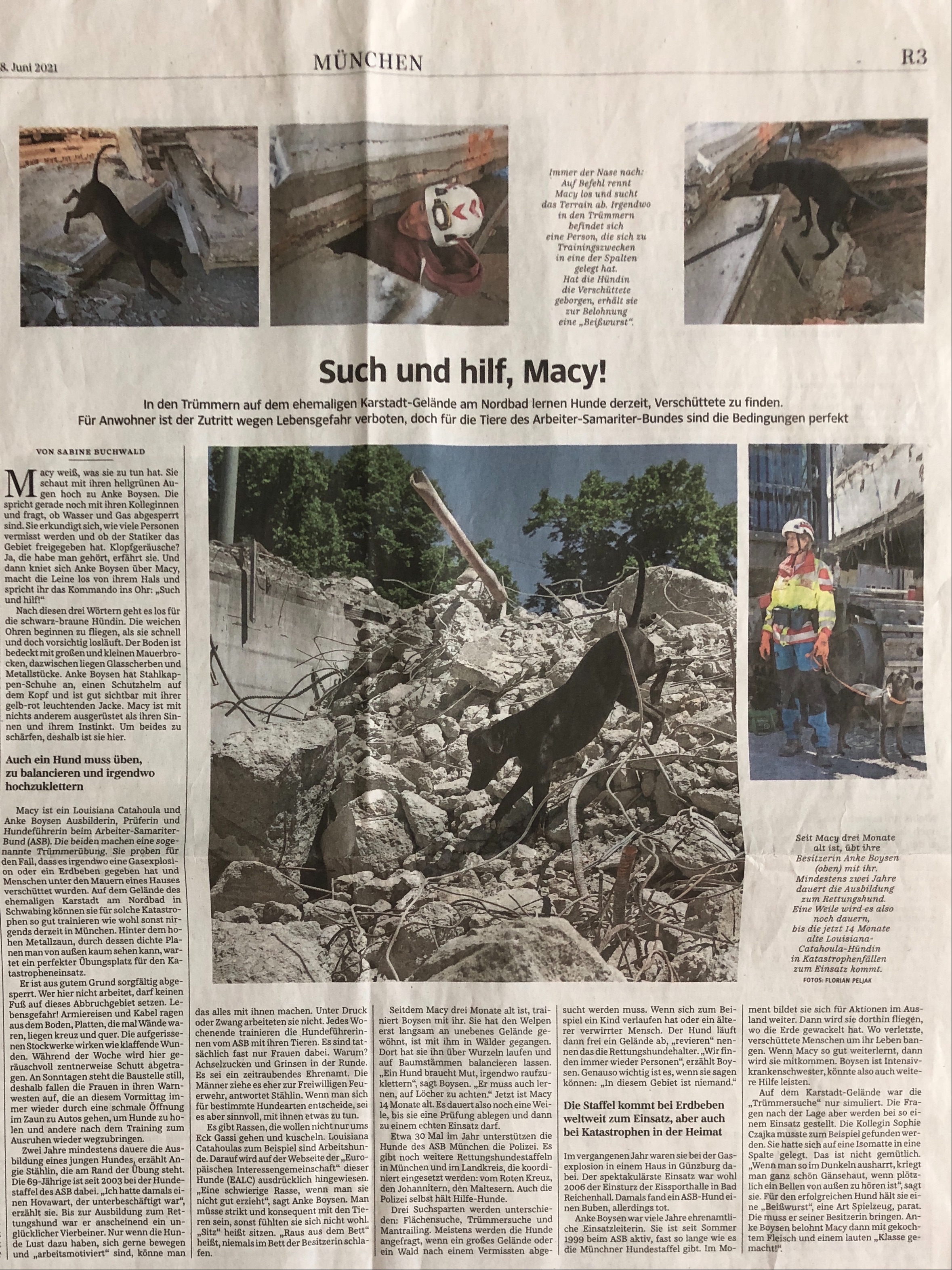 Die Hunde der ASB Rettungshundestaffel trainieren derzeit auf dem Abriss-Gelände eines ehemaligen Kaufhauses in der Nähe der Münchner Innenstadt. Die Süddeutsche Zeitung und der Bayerische Rundfunk berichteten davon.